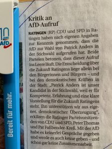 Wir als AfD in Ratingen dementieren hiermit ausdrücklich jede Absprache mit CDU/SPD oder irgendwelchen anderen selbsternannten „demokratischen Fraktionen“ in Bezug auf die Kommunalwahl. Nichts liegt uns ferner als irgendeine Kungelei mit Altparteien. Die haben sich selbst ins Abseits gestellt. Allerdings stellt sich die Frage, welche Zusage die CDU wohl der SPD gemacht hat als Gegenleistung für die Wahlhilfe? Bekommt jetzt Ratingen die von den Roten seit Jahren geforderte kostentreibende zusätzliche Wohnungsbaugesellschaft? Damit die SPD-Funktionäre begehrte Pöstchen im Aufsichtsrat absahnen können? Wir sind gespannt.