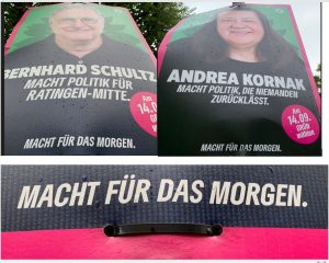Die Kommunalwahl hier in Ratingen ist zwar gelaufen, trotzdem sollten einige skurrile Begleiterscheinungen nicht unerwähnt bleiben. Ein dankbares Thema sind die Plakate der politischen Gegner. Besonders bemerkenswert erschien mir der propagandistische Machtanspruch der Grünen. Nun wurde es bekanntlich nichts mit der grünen Machergreifung in Ratingen. Was die an Mandaten verloren haben, das haben wir an Ratssitzen hinzugewonnen. Klar, dass die Grünen jetzt nicht nur grün hinter den Ohren, sondern auch grün im Gesicht sind.